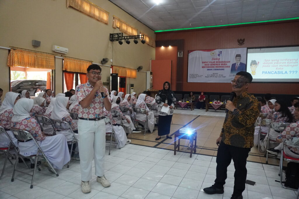 Semarang, derapguru.com – Anggota MPR RI Dr. H. Muhdi, SH., M.Hum. menegaskan pentingnya peran Pancasila sebagai dasar negara dalam membentuk karakter dan moralitas peserta didik. Hal tersebut disampaikannya dalam kegiatan sosialisasi yang berlangsung pada Senin, 15 Desember 2025, di Aula SMA Negeri 2 Semarang, Jawa Tengah, di hadapan Kepala Sekolah, para guru, serta pengurus OSIS.