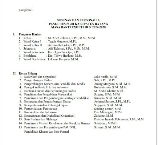 Berikut ini adalah kepengurusan lengkap dari PGRI Batang masa bakti 2024-2029: