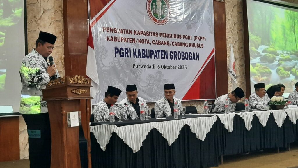Grobogan, derapguru.com. PGRI sebagai organisasi profesi, kini terus berupaya bertransformasi untuk tingkatkan kualitas pendidikan. Kita meyakini bahwa kemajuan pendidikan bergantung pada kualitas para guru. Dalam upaya tersebut PGRI kini terus bertransformasi guna mewujudkan guru-guru yang profesional, sejahtera dan memajukan pendidikan. Demikian diungkapkan Ketua PGRI Drs. Purnyono MM yang juga Kepala Dinas Pendidikan Kabupaten Grobogan saat memberi sambutan pada acara Penguatan Kapasitas Pengurus ( PKP) PGRI Kabupaten, cabang/cabang khusus di hotel Kryad Grand Master Purwodadi, Senin 6 Oktober 2025.
