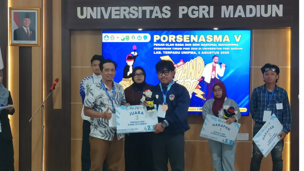 MADIUN, derapguru.com — Komika UPGRIS, Muhammad Jahrut Thavdil, dari Prodi PJKR FPIPSKR berhasil meraih Medali Perunggu dalam perlombaan tangkai seni Stand Up Comedy pada Porsenasma PT PGRI di Universitas PGRI Madiun, Senin 4 Agustus 2025.