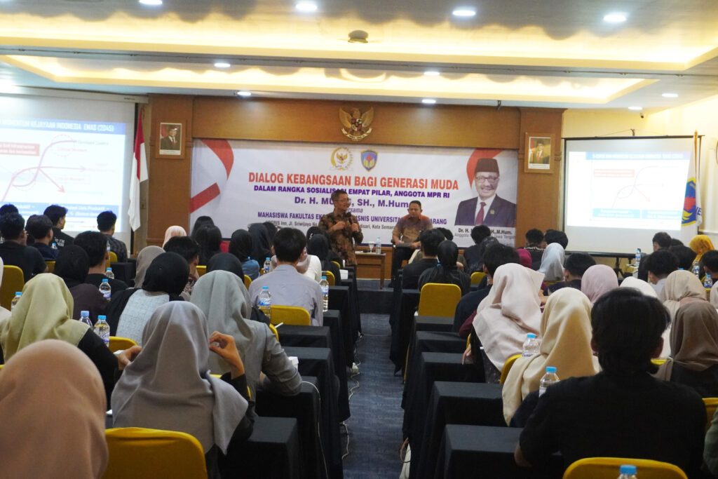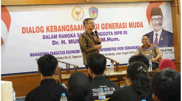 Hal tersebut disampaikan Anggota MPR RI yang juga Wakil Ketua Komite I DPD RI, Dr H Muhdi SH MHum, dalam “Dialog Kebangsaan Bagi Generasi Muda” yang digelar Fakultas Ekonomi dan Bisnis (FEB) UPGRIS di Meeting Room UPGRIS Kampus Sriwijaya Semarang, Senin 15 Desember 2025.