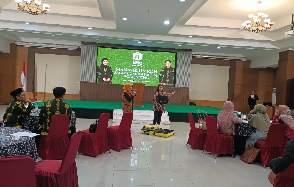 SEMARANG, derapguru.com — Biro Umrah dan Haji Safara PGRI Jateng menggelar kegiatan manasik di Seminar Hall 6ft Menara UPGRIS Kampus Gajah, Jumat 17 Oktober 2025. Acara manasik tersebut diikuti para peserta yang akan berangkat umrah tanggal 11 November 2025 mendatang.