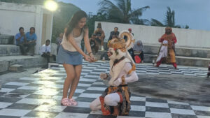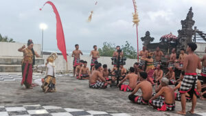 ADA momen menarik dalam pementasan Tari Kecak di Kalangan Lelangon Pantai Pandawa dilangsungkan. Hanoman–kera putih–yang biasanya sangat hiperaktif, tiba-tiba malu ‘disawer’ buah pisang turis cantik Korea.